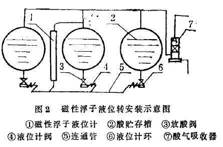 我廠頂裝式磁翻板液位計安裝,采用圖2的形式。三臺酸貯存槽②(三臺以上也可以)合用一臺液位計,每臺酸槽的出口與液位計,共連在一根連通管上⑤。要看某酸槽液位,開該酸槽通液位計的閥門④,液位即可醒目顯示。如此布置能節(jié)省兩臺液位計,價值四千余元(酸貯存槽數(shù)量越多,節(jié)約效果越大)。此外,在安裝時要注意:裝大浮子時重端向上;裝液位標計(小浮標)時,紅色端向上,這樣可防止磁性相斥。裝完后用備用磁鋼,將小浮標引到大浮子磁性材料處,顯示即可正常。目前頂裝式磁翻板液位計在我廠應用情況良好。