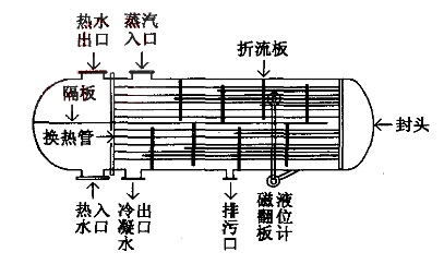 如下圖所示,壓力為0.4~0.6MPa的飽和蒸汽由蒸汽入口進入管式換熱器,經折流板、隔板上下流通,*終其大部分熱量被熱水吸收,形成凝結水從凝結水出口流出。一次熱水(溫度約為20℃)從熱水入口流進,經過從左向右的換熱管流至封頭,在經過從右向左的換熱管從熱水出口流出,變成二次熱水,二次熱水流向系統,放熱后流回換熱站循環水泵入口,經加壓后再次流向熱水入口,如此反復循環加熱,*終向用戶提供80~130℃的高溫熱水。