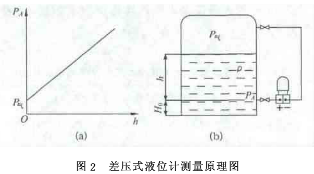 差壓法檢測液位,是將差壓變送器的高壓室(+)接口與HO液層面相連通,低壓室接口(-)與罐頂氣體空間相連通。通過高低壓室膜盒產(chǎn)生形變的程度與“+”、“-”壓室之間的壓力差值(即△P=P+-P-)測得差壓。由式(1)和(2)可知: