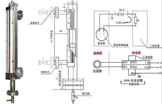 液體液位計是以浮子內磁鋼驅動雙色薄片的翻轉來指示液位的一種新型儀表,主體不銹鋼內腔管中磁浮子隨液位的升降而上下運動,同時驅使主體外指示器內的雙色薄片翻轉,有液位時轉示紅色、無液位時顯示白色。液體液位計以紅色和白色色帶間的界線即代表液位高度。在指示器左側配有醒目的刻度標尺,從而使液位的指示顯得更加清晰。不僅可以實現現場就地觀測,也可以加裝遠傳裝置實現遠程監控及報警等功能。