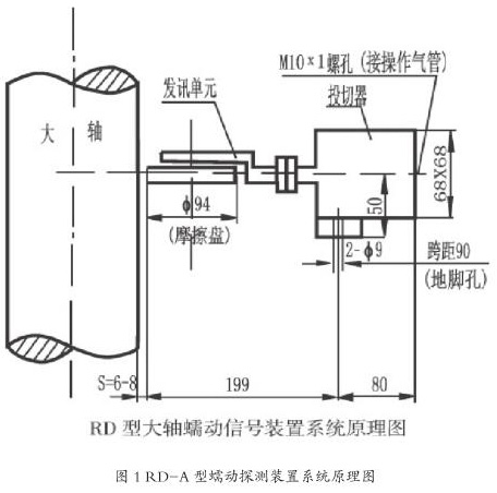 該電站蠕動探測之前主要使用的是氣動式機(jī)械蠕動裝置和電動式機(jī)械蠕動裝置,哈電機(jī)組和 VHS 機(jī)組使用的是氣動式蠕動裝置,型號為 RD-A 哈控,RD-A 型蠕動探測裝置由投切器和發(fā)訊單元兩部分組成,當(dāng)機(jī)組停機(jī)完成后通過蠕動控制電磁閥(空氣電磁閥)向投切器通入壓縮空氣,它將發(fā)訊單元向前推進(jìn),使其磨擦盤與機(jī)組大軸表面相接觸(有稍許正壓力)。如果大軸發(fā)生蠕動,轉(zhuǎn)角達(dá)到 1.5° ~2°時,發(fā)訊單元便發(fā)出大軸蠕動信號,作用于報警與制動回路,投入制動閘以防蠕動現(xiàn)象擴(kuò)延。機(jī)組起動前,先動作空氣電磁閥使投切器排氣,由于彈簧力的作用,發(fā)訊單元退回原位。離開大軸表面 6 mm~8 mm,確保裝置安全。RD-A型蠕動探測裝置系統(tǒng)原理如圖1所示。RD-A型探測裝置易卡澀導(dǎo)致探測裝置投退失敗,影響開停機(jī)成功率。東電機(jī)組使用的是電動式蠕動裝置,型號為 PXJ-1D。PXJ-1D 型蠕動探測裝置多起反饋信號拒動的事件,導(dǎo)致開停機(jī)流程退出,其原因為電動式蠕動裝置控制回路與位置反饋節(jié)點取自同一個行程開關(guān),當(dāng)行程開關(guān)常閉節(jié)點斷開時,電機(jī)停止轉(zhuǎn)動,而此時可能因行程過短導(dǎo)致常開節(jié)點尚未閉合,位置信號無法正常上送至監(jiān)控系統(tǒng)。為了解決這一問題,目前電站 15 臺機(jī)組蠕動探測裝置已換型為非接觸式蠕動探測裝置,避免開停機(jī)過程中投入或退出蠕動失敗導(dǎo)致的流程退出。非接觸式蠕動探測裝置設(shè)計原理為 :