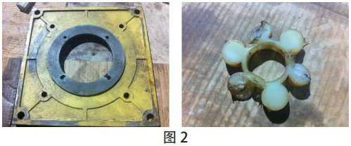 2015 年 9 月 23 日運行過程中,02:15 因“機組高位油箱低油位動作”停機。現場拆解稀油站 1# 低壓油泵,發現油泵與底座 2 顆連接螺栓脫落、出油管松脫、底座螺孔拉崩、螺孔周圍多處裂紋、緩沖墊破損等諸多問題。造成油泵無法供油,引起停機。如圖 2 所示。