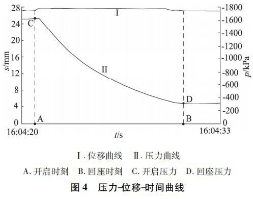 運用安全閥冷態(tài)試驗裝置對該鍋爐水液位計進行動作性能試驗,將試驗容器內(nèi)的介質(zhì)壓力卸放到整定壓力以下,開啟試驗容器和安全閥進口端的球閥,關(guān)閉流量計管路閥門,開啟主測試管路截止閥,開啟儲氣容器通向試驗容器的節(jié)流閥,逐漸加壓,同時啟動計算機數(shù)據(jù)采集系統(tǒng),被試安全閥開啟,繼續(xù)升高壓力,直至被試安全閥保持全開啟( 排放) 狀態(tài),然后關(guān)閉儲氣容器通向試驗容器的閥門,被試安全閥亦逐漸關(guān)閉。計算機自動生成試驗過程的壓力、位移曲線,試驗人員記錄采集開啟壓力、排放壓力、回座壓力、開啟高度等數(shù)據(jù)。重復(fù)上述試驗至少 3 次,得到相應(yīng)壓力-位移-時間曲線,見圖 4。左縱坐標(biāo)為位置,右縱坐標(biāo)為壓力,其中上部曲線代表導(dǎo)閥位移,下部曲線代表壓力變化。當(dāng)導(dǎo)閥位置發(fā)生變化,代表導(dǎo)閥開始開啟動作,此時的壓力為該鍋爐水液位計的開啟壓力,即整定壓力; 當(dāng)導(dǎo)閥位置回到原點代表導(dǎo)閥已經(jīng)回座,此時對應(yīng)的壓力即為回座壓力。