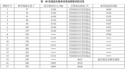 (4)方案四:調(diào)整組合軸承潤滑油量經(jīng)過主機制造廠設計部計算復核,認為現(xiàn)有油泵有可能滿足冷卻要求。經(jīng)過與電廠溝通,聯(lián)合制定了減少組合軸承用油量的試驗方案。主要措施為:在組合軸承供油管調(diào)節(jié)閥后組合軸承前增加一壓力表,用于監(jiān)視組合軸承供油壓力。機組在滿負荷運行條件下,分階段逐步調(diào)整節(jié)流閥減少供油量,監(jiān)視記錄組合軸承供油壓力和組合軸承溫度,直到單臺油泵滿足用油量略有余量、備用泵處于備用狀態(tài)下,正向推力瓦*高溫度控制 55℃以內(nèi)。*后恢復單冷卻器運行和環(huán)境溫度*高條件下檢驗軸承溫度。