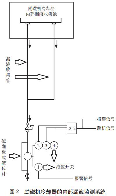 實際運行經驗表明,防凍液位計內部銅管發生泄漏的概率較低,但一旦發生泄漏,漏液會隨著冷卻空氣沿閉合風路進入勵磁機內部,造成勵磁機短路損壞的嚴重后果。為了保證機組安全,應有冷卻器內部銅管泄漏監測裝置,然而現場沒有配置此類裝置。