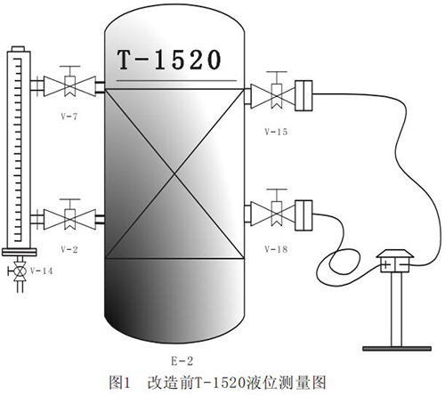 以溶劑吸收工段吸收塔T-1520為例,將該塔處的就地防腐型磁翻板液位計改為反吹法測量液位,并且至中控室,使得T-1520原有的防腐型磁翻板液位計LT-1510多一道對比和參考,對生產工藝的操作更有參考價值。