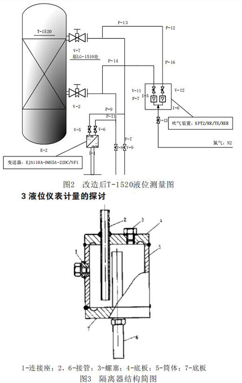 對溶劑吸收工段吸收塔T-1520進行儀表改造,拆除原就地防腐型磁翻板液位計,在原就地液位計處增加一套反吹法測量設備。增加的儀表有:普通磁性浮子液位計1臺:EJA110A-DMS5A-22DC/NF1、反吹風裝置1套、球閥(DN10)3只,¢14不銹鋼管等。圖2為技術改造后的反吹法測量液位的安裝效果圖。