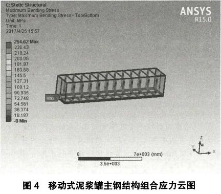 (2)考慮在使用過程中,可能出現兩個滿載的相同泥漿罐疊放的*端工況,因此底部泥漿罐在滿載的情況下還要承受上部相同尺寸的滿載泥漿罐的自重。將上部滿載泥漿罐的自重等效為加載在下部泥漿罐頂結構的均布壓力其中,見為滿載泥漿槽自重,識=168782x9.81=1655752為儲存罐頂部方管的長度乂=29.丨8111。因此/^56.8犯11?。
