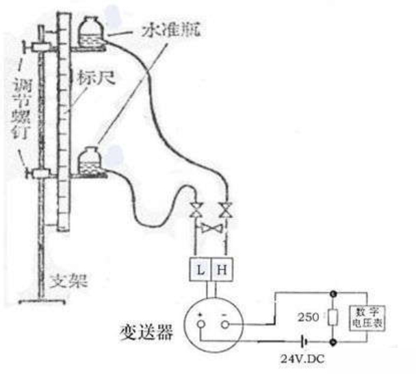 當液體密度恒定時,測出差壓就就可知道液位高度,而與液體容積無關,或者說知道了液體高度,也就知道了差壓,即△P=ρH。模擬校驗法就是基于上述原理進行的。現以校驗水位計為例,介紹一下具體方法,校驗裝置及接線如圖所示: