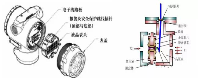雙法蘭差壓變送器結(jié)構(gòu):主要部件為傳感器模塊、電子元件外殼、毛細(xì)管、高低壓側(cè)法蘭及膜片。傳感器模塊包括充油傳感器系統(tǒng)(隔離膜、充油系統(tǒng)和傳感器)以及傳感器電子元件。