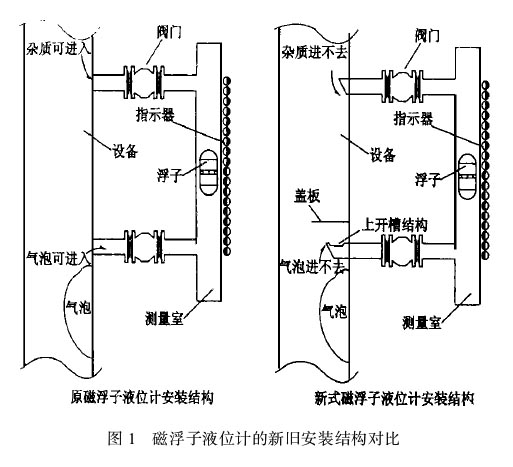 圖1四氟磁翻板液位計的新舊安裝結構對比氣相總是要向上方或斜上方運動,這樣,氣相就不能置換掉下部接管中的液相,也就不能進人液位計測量室,就避免了氣泡對測量的干擾以及“亂磁”現象的產生。