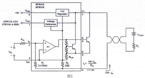 把傳感器輸出的不同電壓轉換成標準的4-20ma輸出,可采用不同的電路形式。成本低的可采用分立器件,但是為了達到比較高的精度,要保證相應器件的匹配程度,調試也比較麻煩。傳感器專用的4-20ma 的一體化變送器集成電路,采用該系列產品設計的變送器成本低,精度高,調試簡單。經過選擇決定使用完成設計。內部結構如圖三: