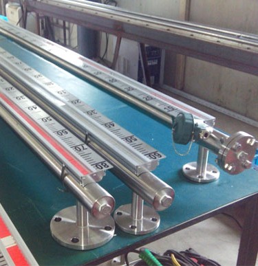 根據浮力原理,浮子在測量管內隨液位的升降而上、下移動,浮子內的永久磁鋼通過耦合作用,驅動紅、白色翻柱翻轉180°,液位上升時翻柱由白色轉為紅色,下降時由紅色轉為白色,從而實現液位指示。